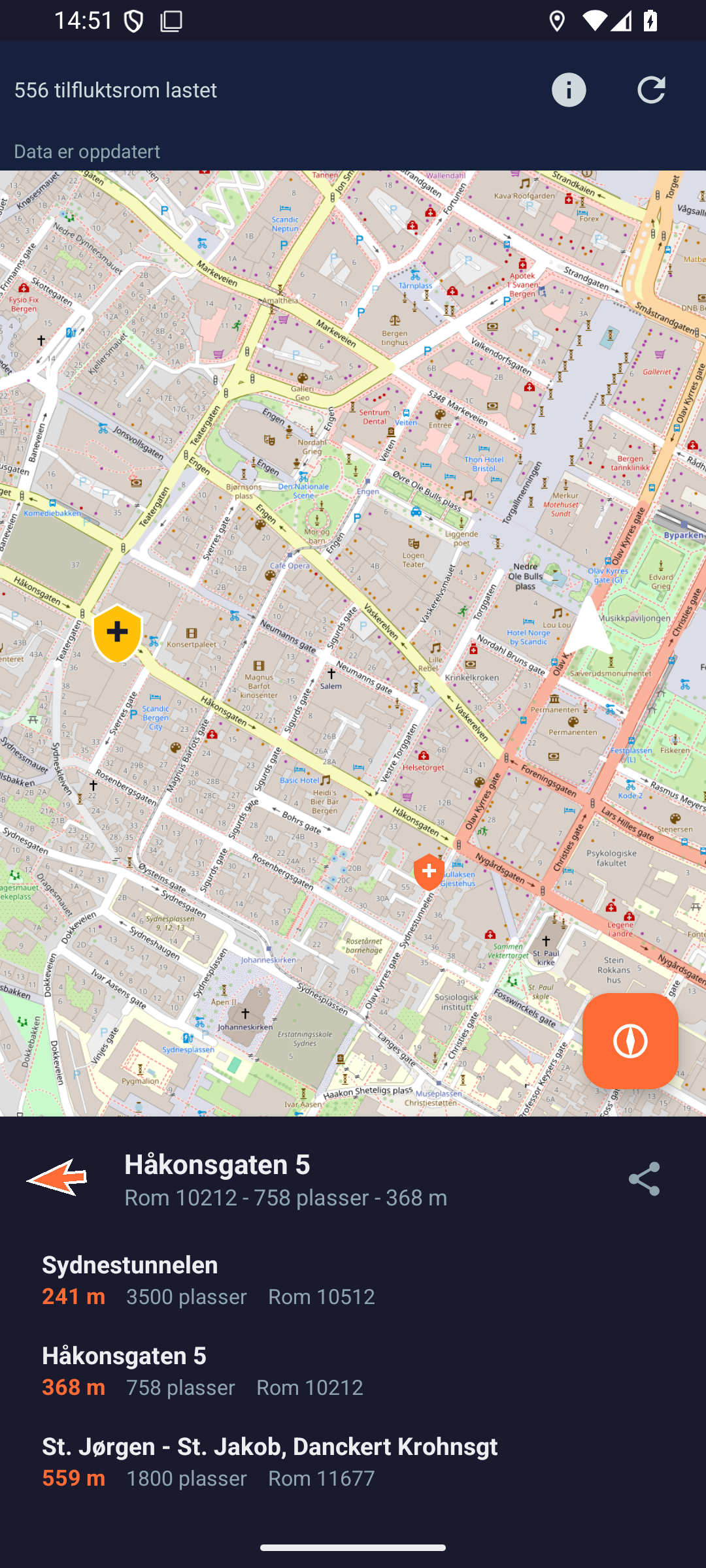 - Kartvisning, valt tilfluktsrom, kompass med nordindikator,